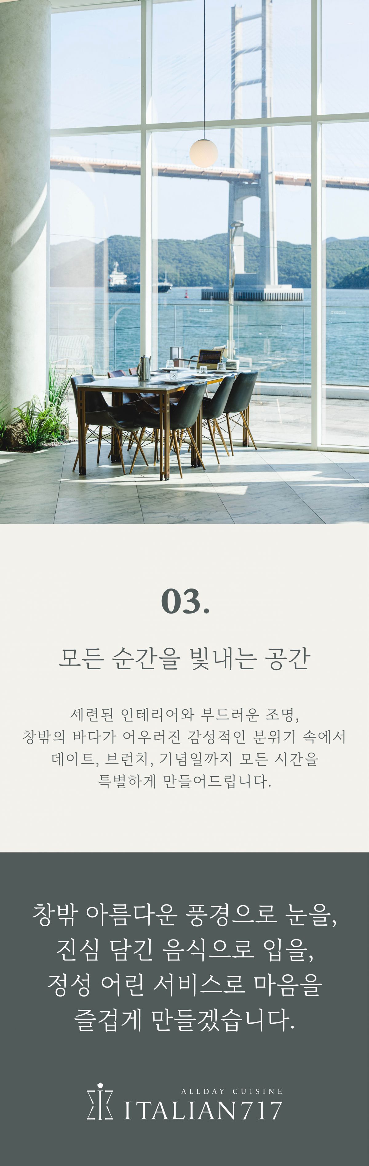 이탈리안717은 창원 귀산 바다를 가장 가까이에서 즐길 수 있는 감각적인 이탈리안 다이닝 공간입니다.